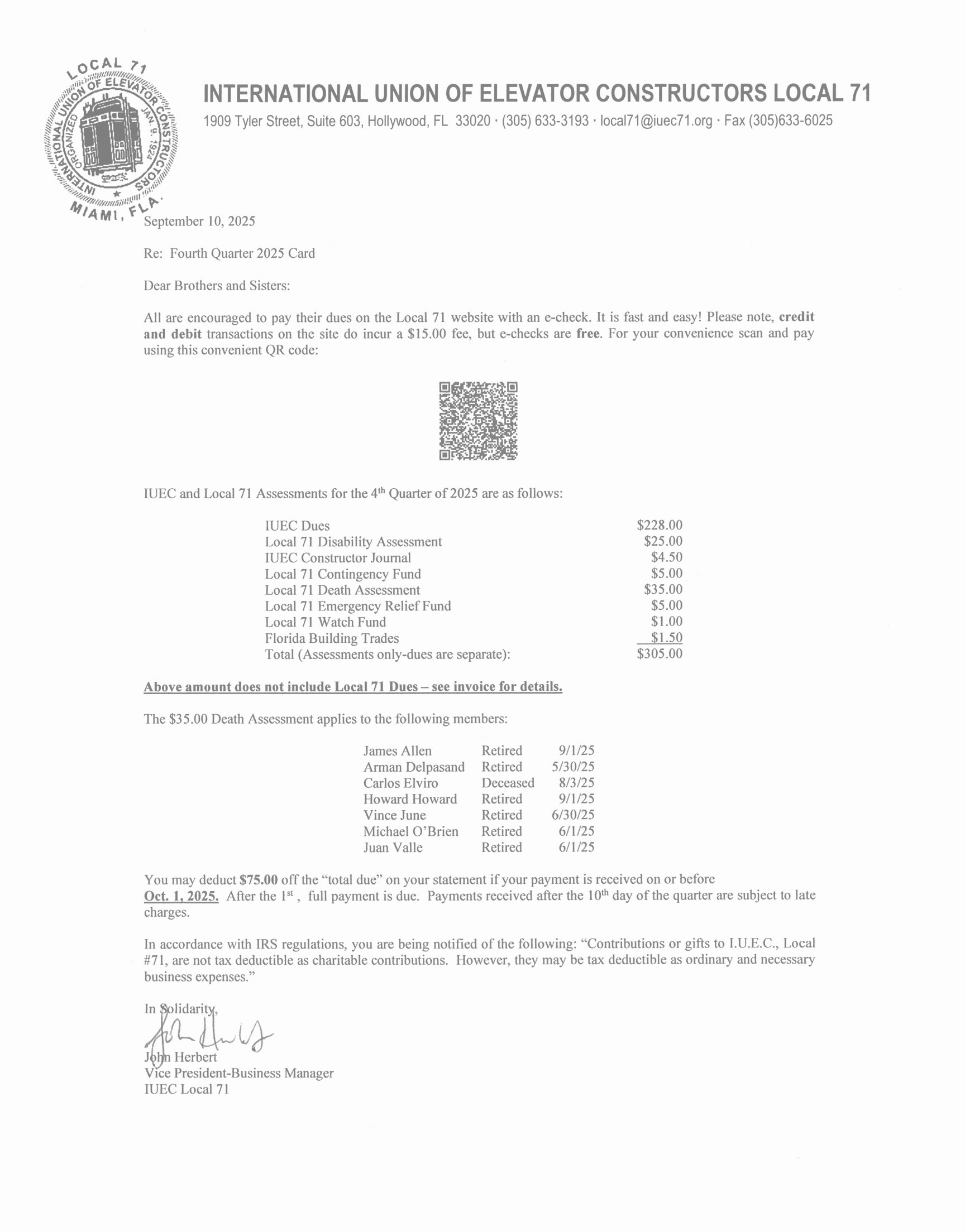 Dear Brothers and Sisters,Please call the Hall if you have any questions about the 4th Quarter 2025 dues. Invoices will be mailed out by 9/15/25. 4th Quarter 2025 Charges for Local 71 Dues/Assessments are as follows:55% Apprentice - $524.00(after $75.00 discount)65% Apprentice - $578.00(after $75.00 discount)70% Apprentice - $605.00(after $75.00 discount)80% Apprentice/ Asst. Mech. - $659.00(after $75.00 discount)Mechanic/TM - $767.00(after $75.00 discount)Unemployed or out on disability - $230.00(after $75.00 discount)